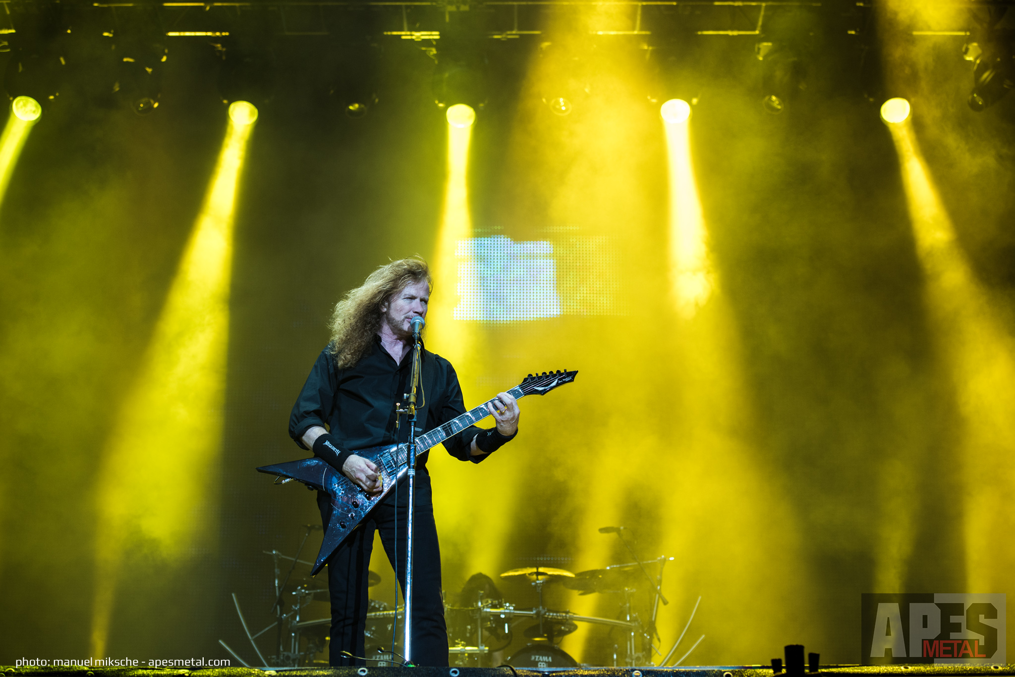Zu etwas späterer Stunde war es endlich an der Zeit für eine der großen Bands des Thrash Metals: Megadeth. Neugierig und erwartungsvoll stand ein Großteil der Besucher vor den Hauptbühnen und wollte sich Dave Mustaine und Bandkollegen nicht entgehen lassen. Besonders groß war die Spannung aber eigentlich deswegen, weil die Leistung bei Auftritten von Megadeth in den letzten Jahren eher unterschiedlich war. So viel kann allerdings schon vorweggenommen werden: Es war nicht ihr schlechtester Auftritt. Die Auswahl der Songs war gut durchdacht, sodass jeder Megadeth-Fan auf seine Kosten gekommen ist, obwohl in der Mitte der Setlist die Spannung etwas fehlte. Glücklicherweise wurde dieses Tief von „Tornado of Souls“ aufgefangen, sodass die Moral schnell wiederhergestellt wurde. Über die Performance der Band muss man allerdings ein paar Worte mehr verlieren. Kiko Loureio, David Ellefson und Dirk Verbeuren waren in Topform und lieferten eine Show ab, die der Musik der Band würdig war. Bei Betrachtung des Gesangs ist das Ganze jedoch nicht so einfach. Dass Dave Mustaine bereits seit einigen Jahren nachgelassen hat, ist nichts Neues, jedes Mal aber trotzdem traurig. Man sieht einen etwas in die Jahre gekommenen Mann auf der Bühne stehen, der zwar seine Gitarre nach wie vor gut im Griff hat, aber sonst eigentlich nicht mehr viel zu bieten hat. Alles was er noch schafft, ist relativ starr auf der Stelle zu stehen und mit geschlossenen Augen nuschelnd die Songs zu singen. Da braucht sich die Band nicht wundern, dass es mit der Konzentration im Publikum teilweise schwierig war, da man sich doch ernsthaft Sorgen machte, ob der gute Dave den ganzen Auftritt überhaupt schaffen würde (da sind Alice Cooper oder der Sänger von Status Quo trotz höherem Alter um Längen fitter). Umso erstaunlicher war es, dass er in den letzten 15 Minuten tatsächlich noch etwas auftaute und sich einmal zu einer Art Headbangen hinreißen ließ. Ob dieser Gesamtzustand auf seinen vergangenen Drogenkonsum zurückzuführen ist oder andere Hintergründe hat, kann an dieser Stelle nicht weiter erörtert werden. Klar ist allerdings, dass es nur bedingt Spaß macht, ihm auf der Bühne zuzusehen, da seine Show mehr nach Quälerei als nach Spaß aussah.